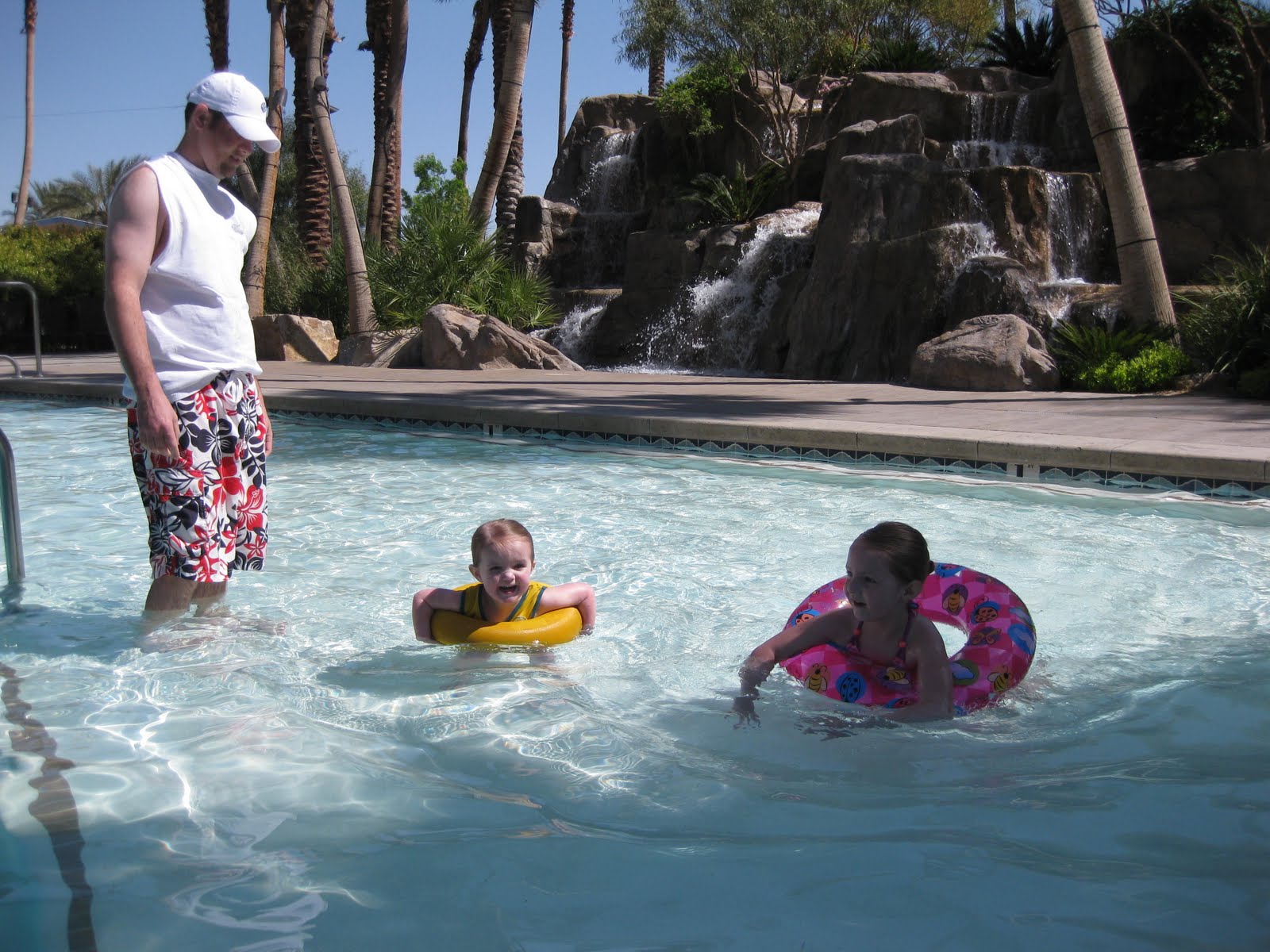 We decided to take a little family vacation before the baby comes. Luckily my dad was able to trade in his time share so we were able to stay in the AWESOME Tahiti Village in Vegas. It is a huge resort with an amazing pool. Let me just say that if you love to swim or just lay out and catch some sun, this is the place to go. It is far enough from the strip that we didn't even have to cover the girls eyes too many times. We did go there one day to explore the M&M Factory. The girls thought that was pretty cool. They wanted to get some cool colored M&M's but Chet refused to pay $14 per pound. What a joke!! After that we decided to stop and eat at the Rainforest Cafe. The girls LOVED it. They sat and admired all the animals. Other than that, we swam the entire time. There was an awesome lazy river that was huge. Kenadee could have spent all day in the pool, and Morgan wanted to play in the sand the entire time. Needless to say, we had a blast and our 5 days there went by way too fast!!